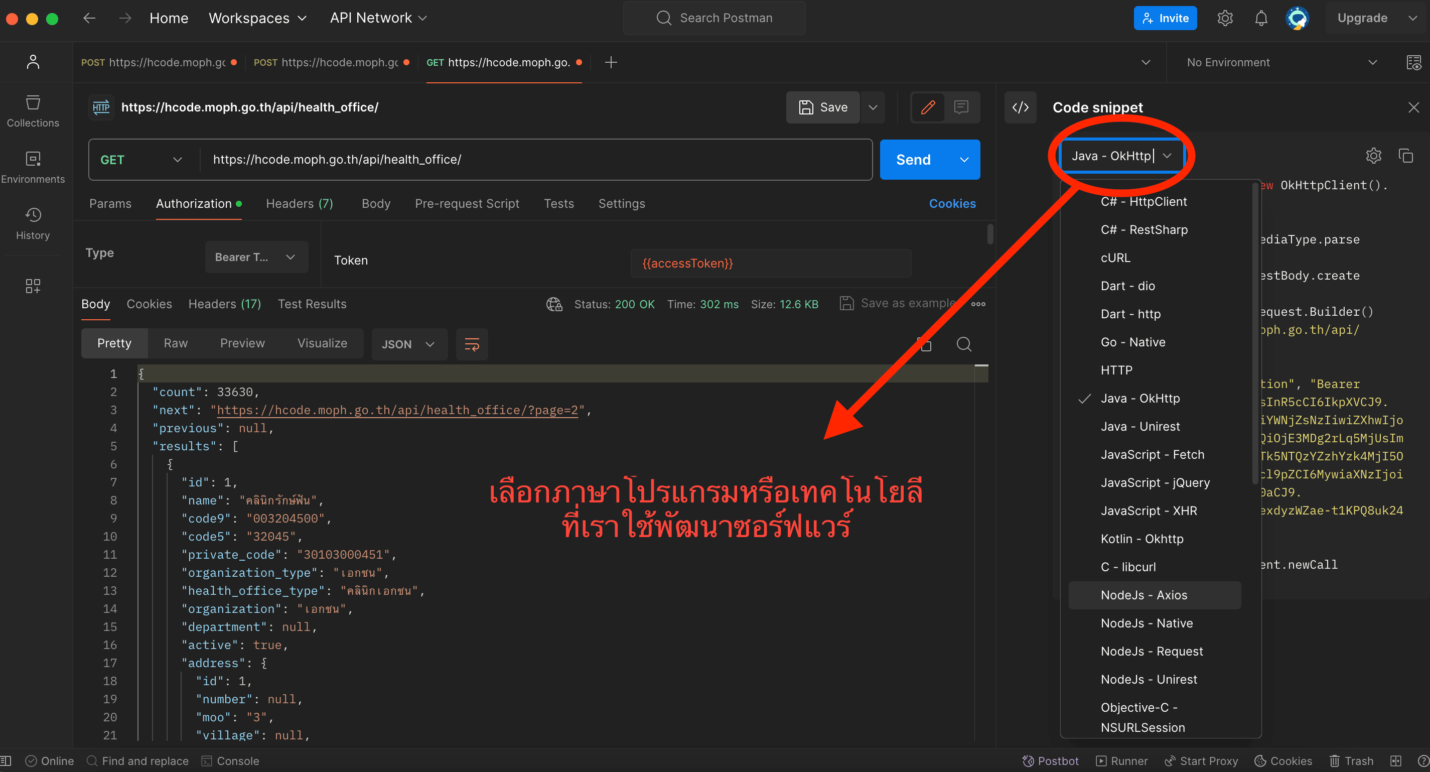 ข้อดีของ Postman ท่านสามารถเลือกตัวอย่าง Code ภาษาโปรแกรมที่ใช้ Request ข้อมูลหน้าปัจุบันโดยคลิกที่ Bracket icon ตามภาพต่อไปนี้