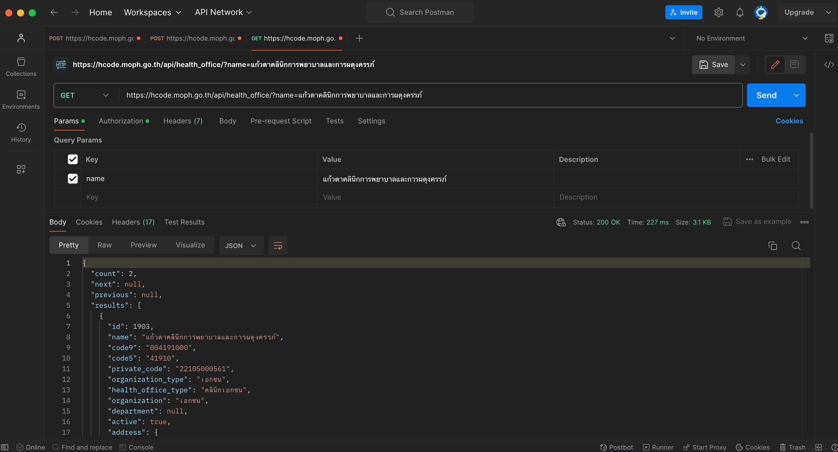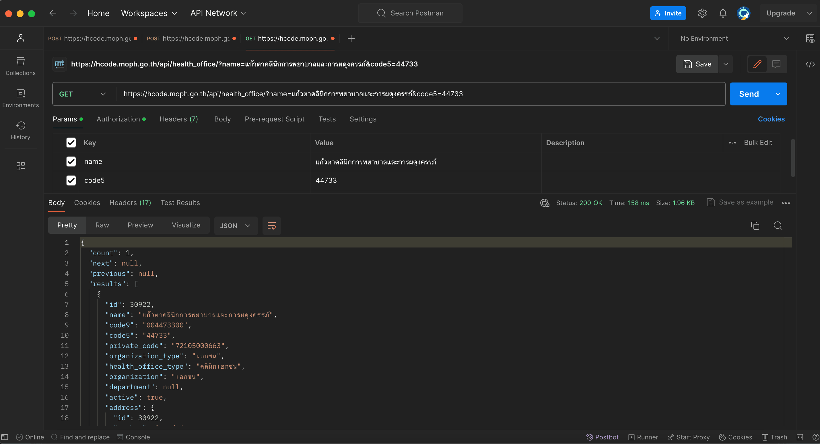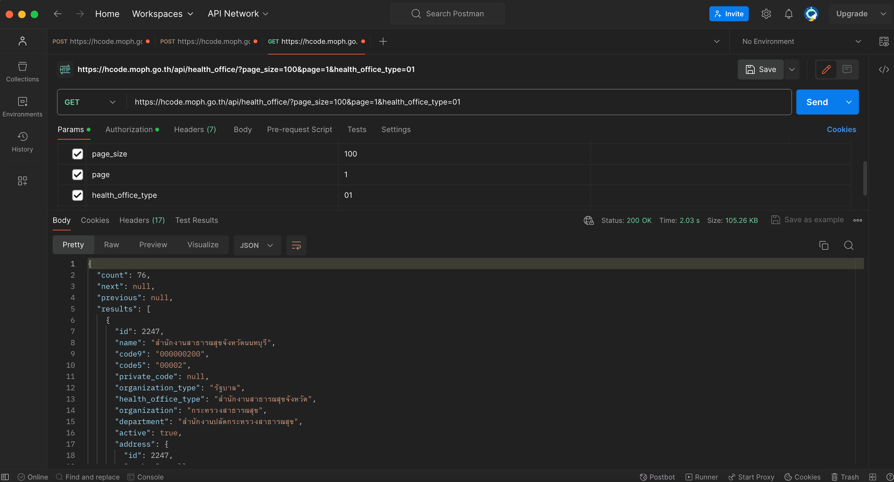 ตัวอย่างนี้กรอง หน่วยงานบริการสุขภาพ ที่เป็น สำนักงานสาธารณสุขจังหวัด โดยใส่รหัส หรือฟิลด์ "code" ในภาพก่อนหน้าแทนการกรองด้วยชื่อ