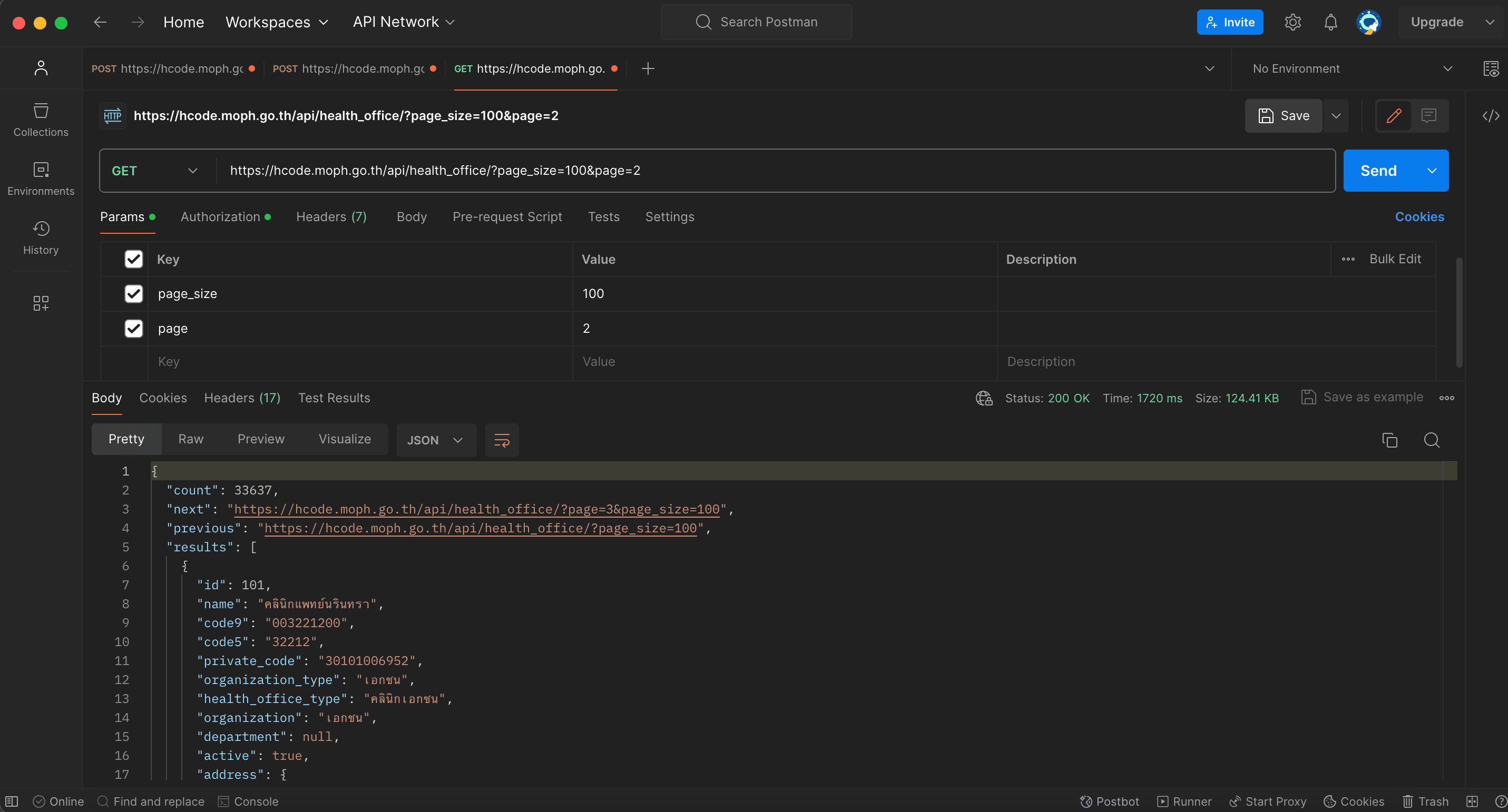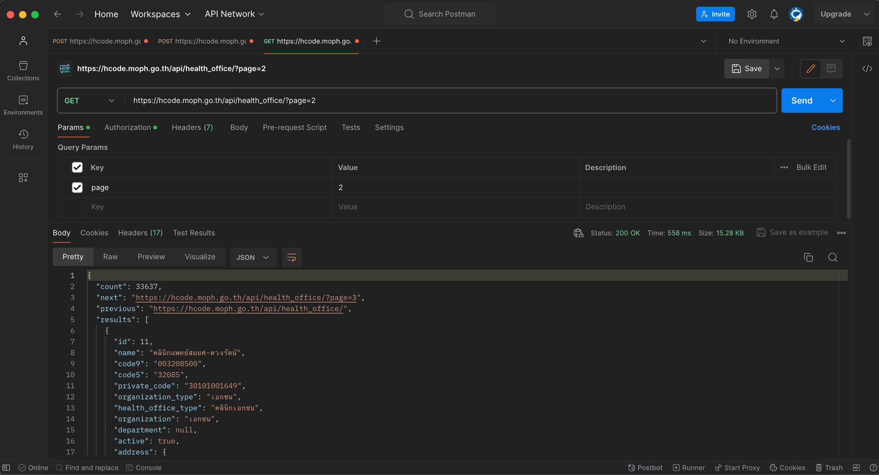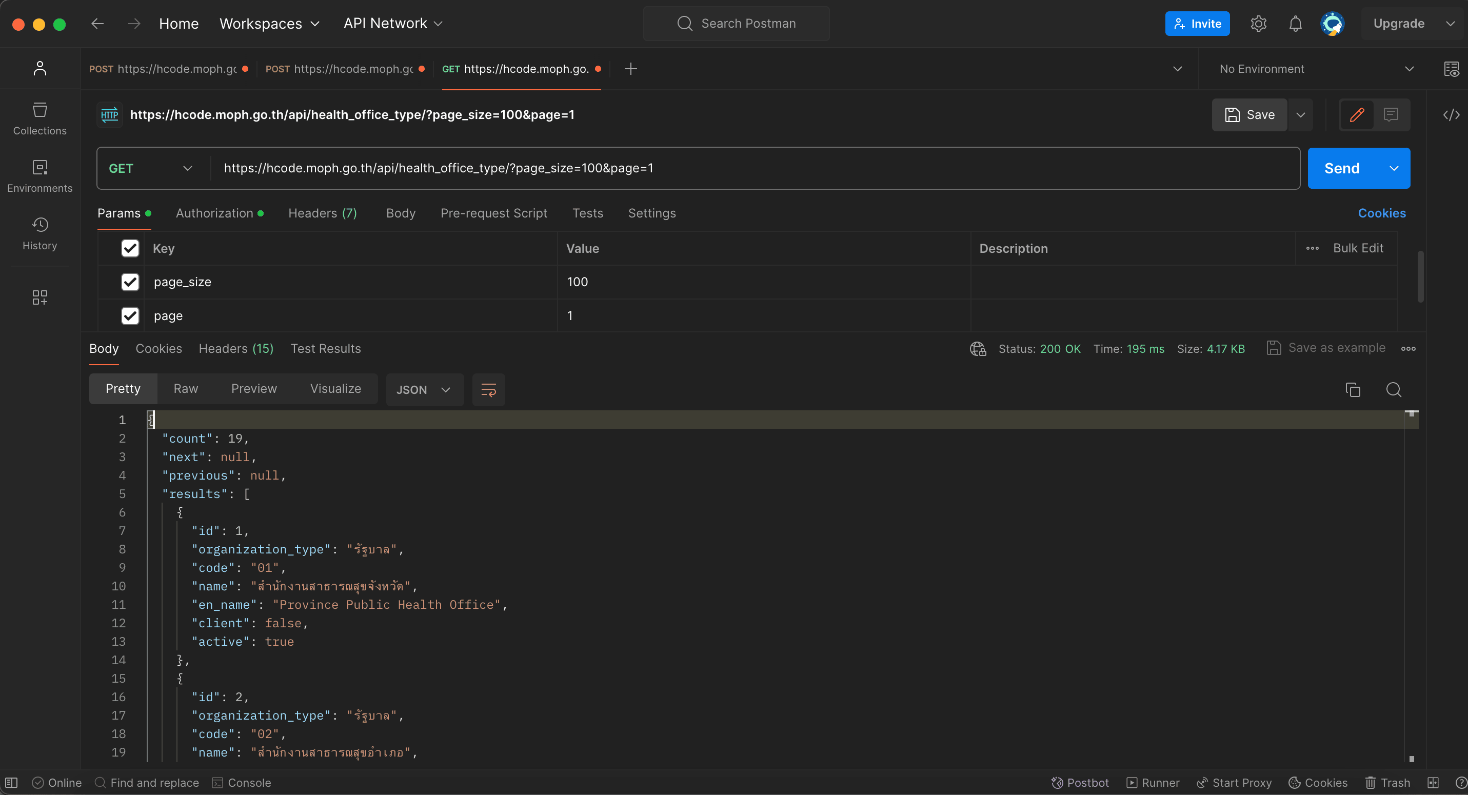 ตัวอย่างนี้กรอง หน่วยงานบริการสุขภาพ ที่เป็น สำนักงานสาธารณสุขจังหวัด โดยใส่รหัส หรือฟิลด์ "code" ในภาพก่อนหน้าแทนการกรองด้วยชื่อ