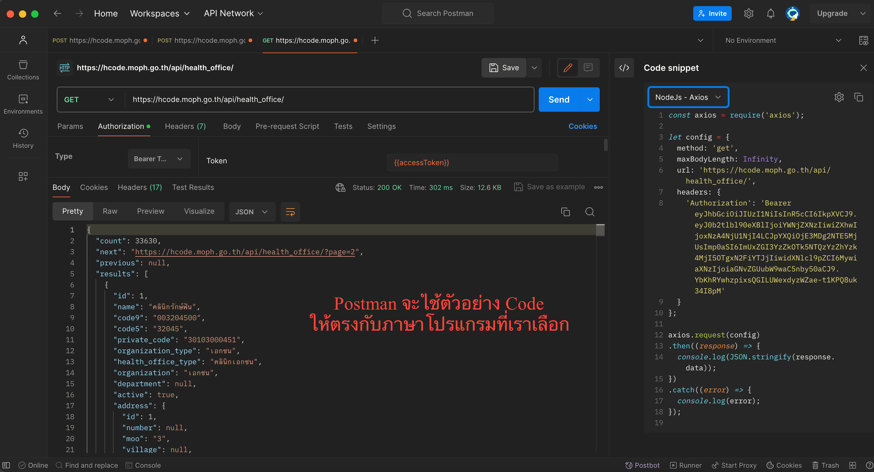 Postman จะ Generate Code ใหม่ให้อัตโนมัติ ตัวอย่างรูปด้านล่างคือโค้ดของ NodeJS (Javascript Runtime Environment) และ Axios (HTTP Request library)