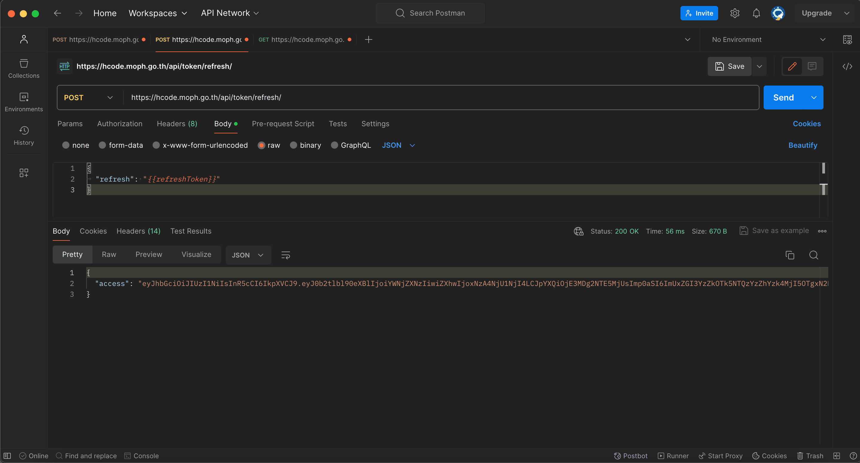 เมื่อ access-token เดิมหมดอายุ สามารถขอใหม่โดยใช้ POST ส่ง JSON ที่มี Key เป็น "refresh"